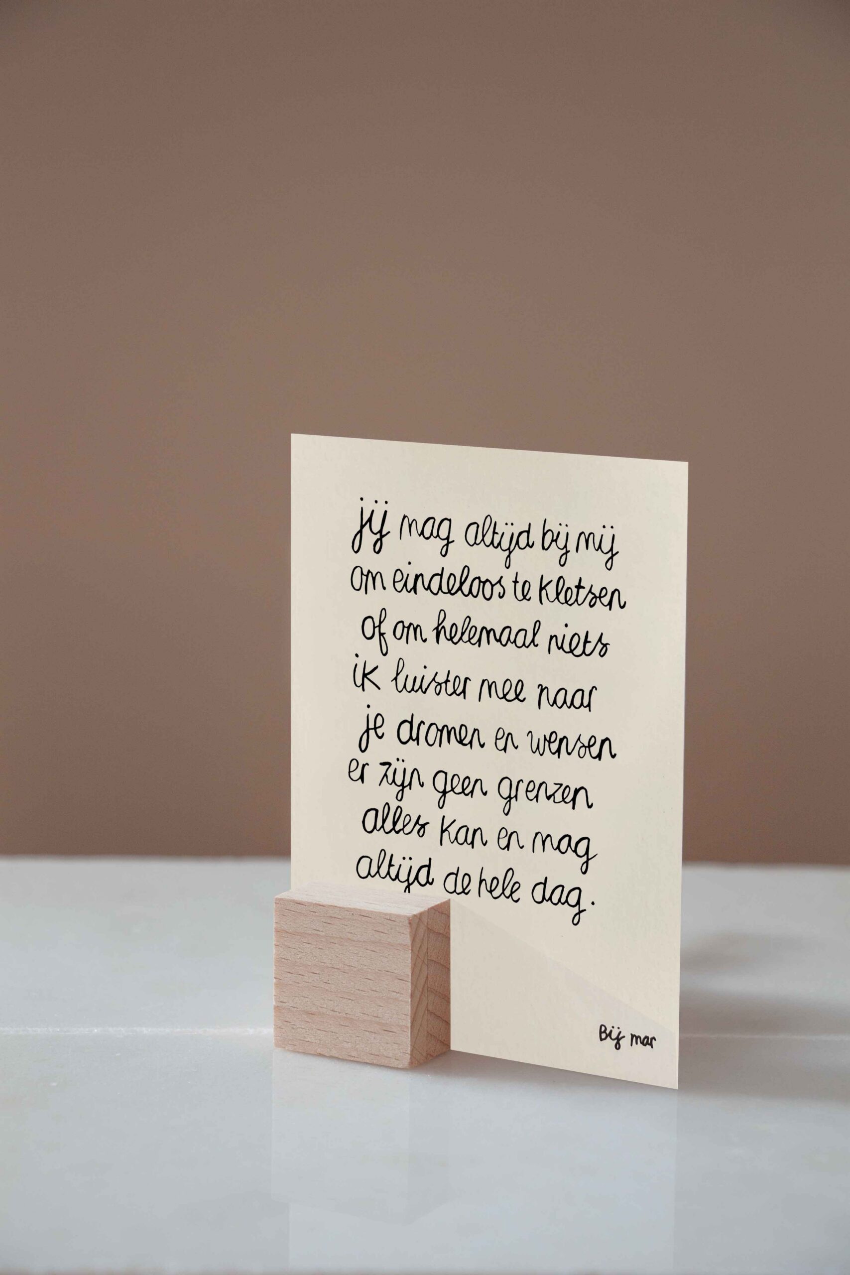 Collectie handgeschreven kaarten, Bij Mar. Kies een kaartje om steun te bieden, om iemand te laten weten dat je aan diegene denkt. Een kaartje met een liefdevolle boodschap om zo jouw medeleven op een warme manier over te brengen. De kaartjes passen prachtig in de Hold it’s.