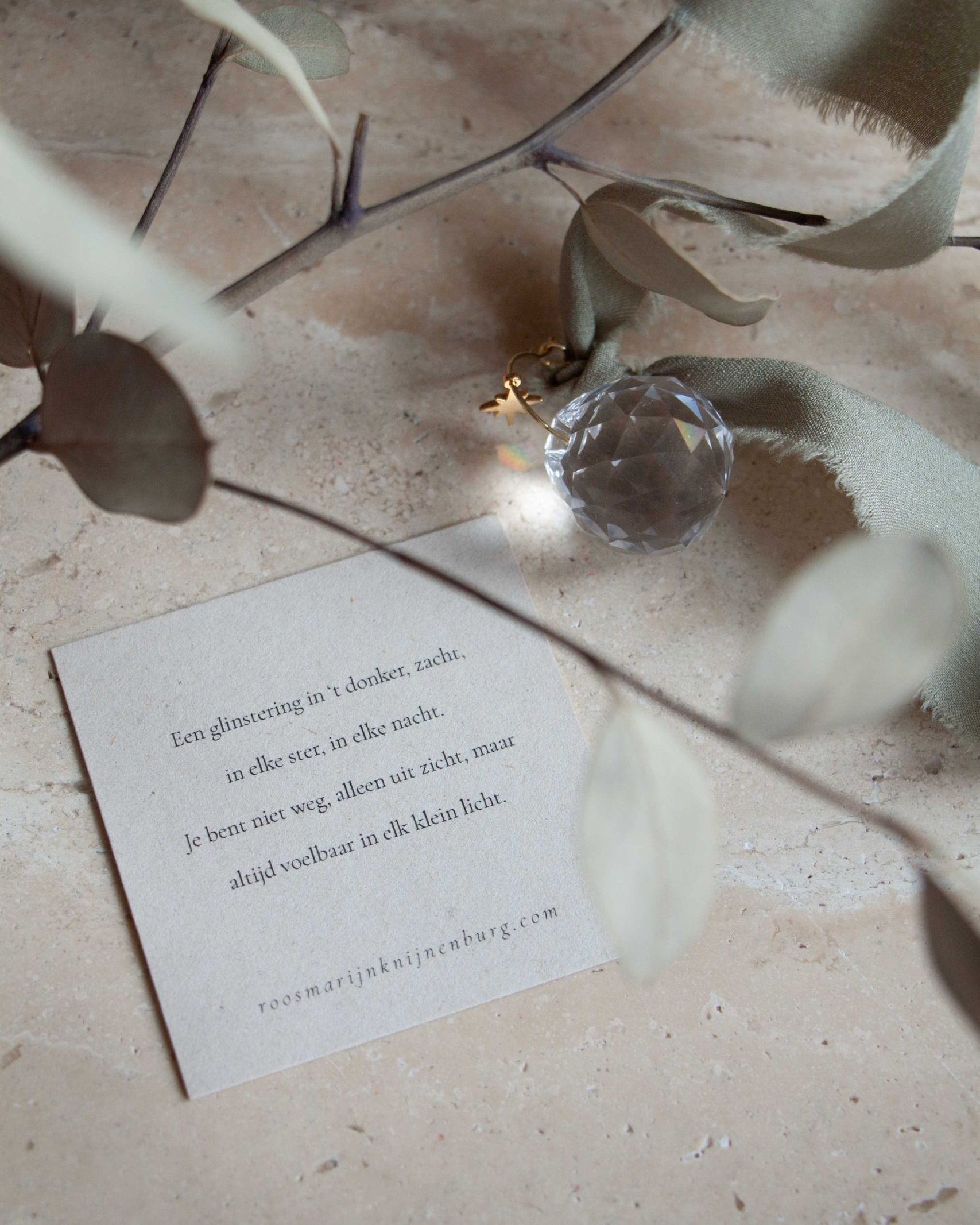 Via de geslepen facetvlakken wordt het zonlicht gebroken in regenboogkleuren, die door de hele kamer dansen. Geef iemand een zonnevanger met een lief gedichtje om te steunen. Een duurzaam geschenk voor bij verlies, verdriet of een lief cadeautje om te laten weten dat je aan diegene denkt!