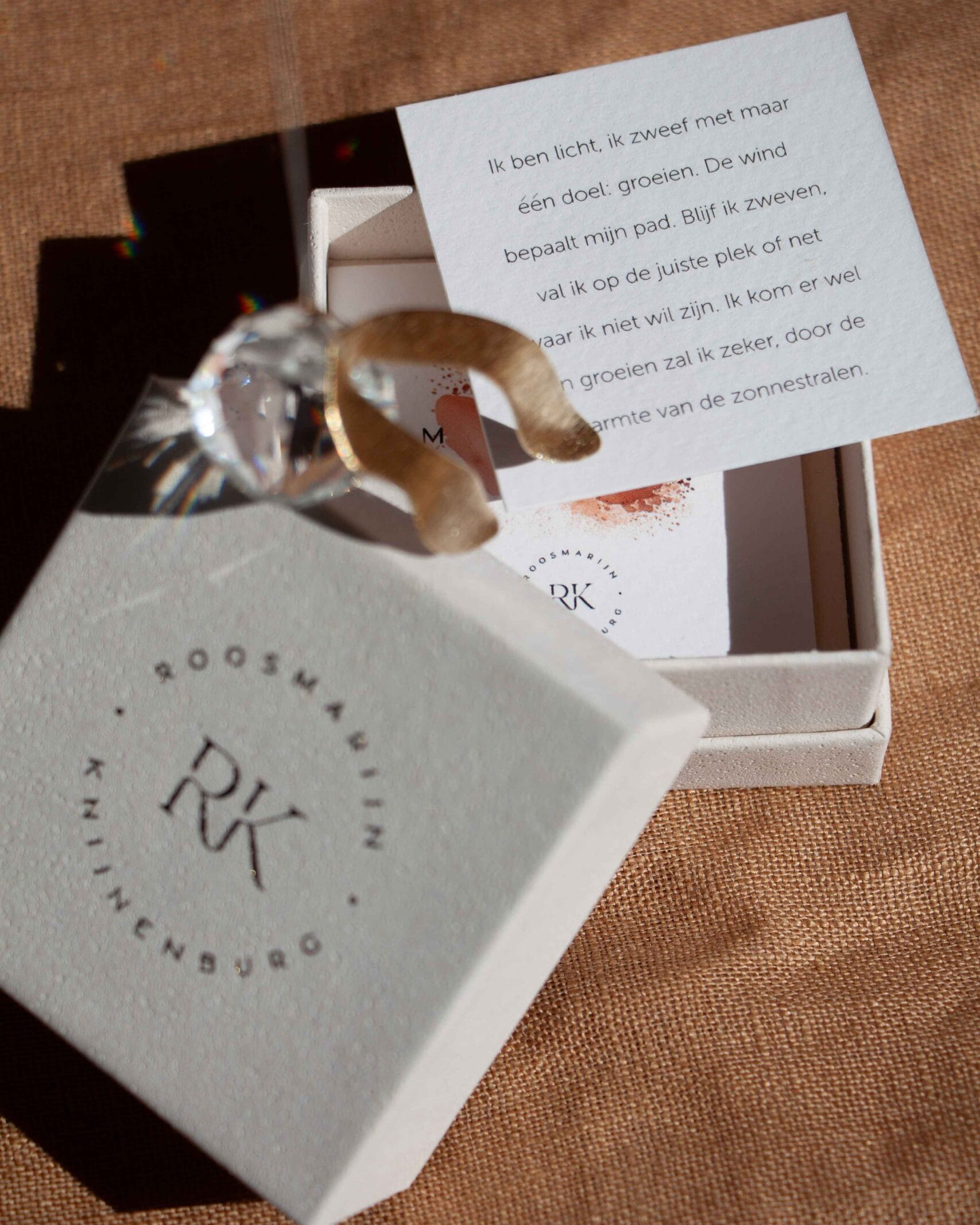 kristal zonnevanger 2 cm in een mooi doosje beige bruin / messing esdoornzaadje / gedichtje
